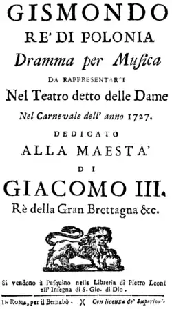 2. ^ a b Briani, Francesco; Vinci, Leonardo (1727). Gismondo, re' di Polonia; dramma per musica da rappresentarsi nel teatro detto delle dame nel carnevale dell'anno 1727 (1st ed.). Rome: Bernabò.