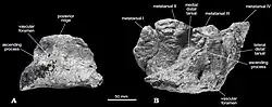 The astragalus is low and elongate from across side to side and the medial portion lacks the craniocaudally broadening compared to the lateral portion, a trait found in most non-eusauropods. The astragalus is weakly convex at the lower end, though this is not as extreme as in Blikanasaurus and Lessemsaurus. The upper surface of the astragalus is softly convex because it is where the lower end of the tibia (shin bone) articulates with the astragalus. This surface is pierced by two foramina (small openings in bone) that have been interpreted as vascular foramina. The ascending process (protrusion of bone) is mound shaped and its upper articular surface faces proximomedially. The distal tarsals have a laterally elongated triangular shape in when seen from their top ends. The corners of the tarsals are rounded and bulbous, especially in the posteromedial corner. The medial distal tarsal is not confined solely to metatarsal III, but also barely contacts the proximal end of metatarsal II, like in Saturnalia. The lateral distal tarsal has a quadrangular shape and was likely longer mediolaterally than proximodistally.[3]