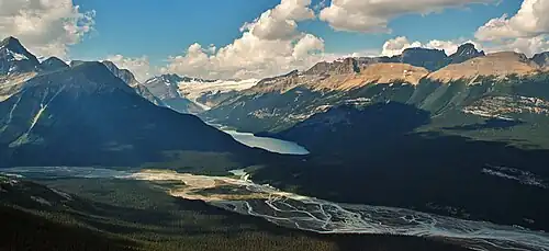 Glacier Lake (centered) seen from Mt. Sarbach. Mt Outram to far left, Division Mountain and Lyell Glacier in back, Mount Erasmus to right, and Howse River across bottom of frame.