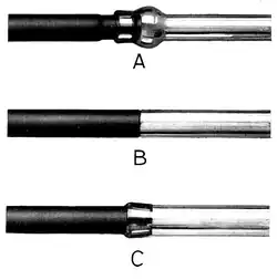 If large parts of copper are to be fitted to glass like the water cooled copper anode of a high power radio transmitter tube or an x-ray tube historically the Houskeeper knife edge seal is used. Here the end of a copper tube is machined to a sharp knife edge, invented by O. Kruh in 1917. In the method described by W.G. Houskeeper the outside or the inside of the copper tube right to the knife edge is wetted with glass and connected to the glass tube.[11] In later descriptions the knife edge is just wetted several millimeters deep with glass, usually deeper on the inside, and then connected to the glass tube.