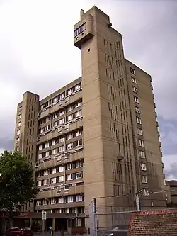 Glenkerry House is a Grade II listed housing block on the Brownfield Estate in Poplar, London, England, designed by the studio of the controversial Brutalist architect Ernő Goldfinger[2] and finished in 1977.[1][3] 14 storeys high, it stands in proximity to and complements the appearance of Balfron Tower and Carradale House, which were designed by Goldfinger himself and are now Grade II* and Grade II listed respectively. There are four four-bedroom maisonettes on the ground floor, 18 one-bedroom, 45 two-bedroom and 12 three-bedroom flats; 79 flats in all.[4]