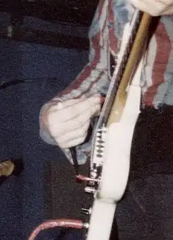 Glide guitar is a technique for playing electric guitar in which the player holds the vibrato bar and manipulates it while strumming, resulting in a wavering pitch. It was developed with and is usually associated with a Fender Jazzmaster or Jaguar-style vibrato system.[1] It was popularized by Irish musician Kevin Shields of My Bloody Valentine on the band's releases You Made Me Realise (1988)[1] and Isn't Anything (1988).[2] Shields often combined this technique with a reverse reverb effect from a Yamaha SPX90 unit or Alesis Midiverb II, and would also utilize nonstandard tuning systems.[3]