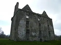 The castle is rectangular with two towers protruding to the south. It has two chimney shafts, each a battery of five diagonal stacks. The windows are mullioned with weepers. Defensive features included gun loops, bartizans and high basements. It was once surrounded by a bawn wall with turrets but little of that remains.[4]