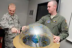 Trainer using a celestial sphere to show student a point used to see the apparent path the sun takes through the stars.