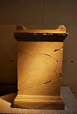 The focal point of sacrifice was the altar (ara, plural arae). Most altars throughout the city of Rome and in the countryside would have been simple, open-air structures; they may have been located within a sacred precinct (templum), but often without an aedes housing a cult image.[17] An altar that received food offerings might also be called a mensa, "table."[18]