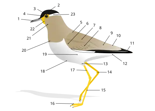 External anatomy (topography) of a typical bird: 1 beak, 2 head, 3 iris, 4 pupil, 5 mantle, 6 lesser coverts, 7 scapulars, 8 coverts, 9 tertials, 10 rump, 11 primaries, 12 vent, 13 thigh, 14 tibio-tarsal articulation, 15 tarsus, 16 feet, 17 tibia, 18 belly, 19 flanks, 20 breast, 21 throat, 22 chin, 23 eyestripe