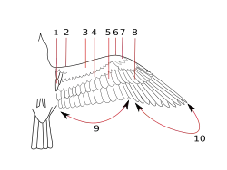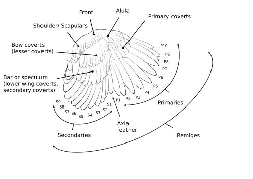 Drawing of the various parts of a bird's wing