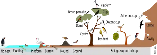 Birds, such as the common goldeneye, indigobirds, whydahs, honeyguides, cowbirds and New World cuckoos, that lay their eggs in other birds' nests, in order to have their chicks incubated through fledging by the parents of another bird, often of another species.[57][58][59]