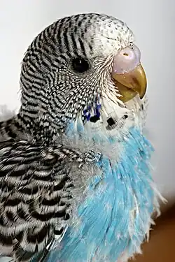 From the Latin cera meaning 'wax', a waxy structure which covers the base of the bills of some bird species from a handful of families—including raptors, owls, skuas, parrots, turkeys and curassows. The cere structure typically contains the nares, except in owls, where the nares are distal to the cere. Although it is sometimes feathered in parrots,[91] the cere is typically bare and often brightly coloured.[92] In raptors, the cere is a sexual signal which indicates the "quality" of a bird; the orangeness of a Montague's harrier's cere, for example, correlates to its body mass and physical condition.[93] The colour or appearance of the cere can be used to distinguish between males and females in some species. For example, the male great curassow has a yellow cere, which the female (and young males) lack,[94] and the male budgerigar's cere is blue, while the female's is pinkish or brown.[95]