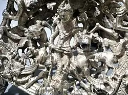 The decoration has been interpreted as a struggle between the forces of good and evil, and has speech and silence as a theme, with some of the figures placing hands over the mouths of others.[4] An inscription round the outside of the drip pan reads "+ lvcis.on[us] virtvtis opvs doctrina refvlgens / predicat vt vicio non tenebretvr homo" ("This flood of light, this work of virtue, bright with holy doctrine instructs us, so that Man shall not be benighted in vice"), and some figures are crawling up through the decoration, towards the light, while others are making away from it downwards.[3]