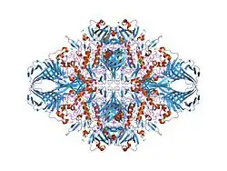 10. ^ a b c Jacobson RH, Zhang XJ, DuBose RF, Matthews BW (June 1994). "Three-dimensional structure of beta-galactosidase from E. coli". Nature. 369 (6483): 761–6. Bibcode:1994Natur.369..761J. doi:10.1038/369761a0. PMID 8008071. S2CID 4241867.