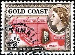 The Gold Coast was a British Crown colony on the Gulf of Guinea in West Africa from 1821 until its independence in 1957 as Ghana.[3] The term Gold Coast is also often used to describe all of the four separate jurisdictions that were under the administration of the Governor of the Gold Coast. These were the Gold Coast itself, Ashanti, the Northern Territories protectorate and the British Togoland trust territory.[4]