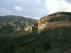 The park is 320 km (200 mi) from Johannesburg and is close to the villages of Clarens and Kestell, in the upper regions of the Little Caledon River.[4] The park is situated in the Rooiberge of the eastern Free State, in the foothills of the Maluti Mountains. The Caledon River forms the southern boundary of the park, as well as the border between the Free State and Lesotho. The elevation ranges from a 1,800 m (5,900 ft) plateau in the north to heights of 2,700 m (8,900 ft) in the south.[9] The highest peak in the park (and also in the Free State) is Ribbokkop at 2,829 m (9,281 ft) above sea level.[6]