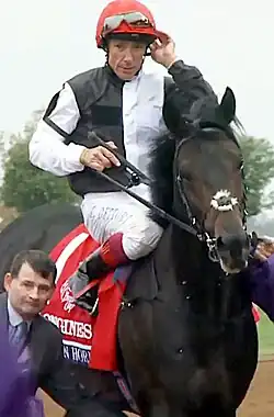 Dettori, who was winning the race for a record-equalling fourth time, said "I really believed in the horse. I was going so fast in the last 300 metres I knew no other horse would pass me. I had the best horse and I wanted to show how good he is. His record is unbelievable and he is probably the best horse I have ridden".[44] Gosden, who was winning the race for the first time said "It's great to win the Arc in France and the Derby in England – that's what it's about. When you're drawn wide, if you stay wide for a long time, you can run your own little race and not be bothered by anyone and then slot across. It was perfect as we sat behind the pacemaker and then kicked because as Frankie says, if you don't kick at a certain time here they come like arrows at your back".[45] He also suggested that the horse might make a final appearance in the Breeders' Cup Turf, saying "The owner is keen on the Breeders' Cup. It's a month away. If he's in good order, there's no reason we couldn't go there".[46]