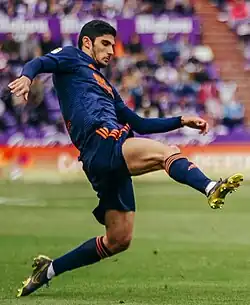 From October 2019 until the following February, Guedes was out with a right ankle injury.[21] On 30 December, he was sent off for swearing at the referee in a 2–1 loss at Granada.[22] He had the most prolific season of his career in 2021–22, finishing as his team's joint top scorer alongside Carlos Soler with 11, while also playing the most games with 36 and most minutes with over 2,500;[23] this included two goals in a 4–3 win at Levante in the Valencia derby on 20 December.[24] In March 2022, his long-range strike against Athletic Bilbao was the decisive goal that sent his team to another Copa final.[25]