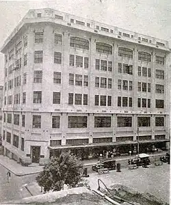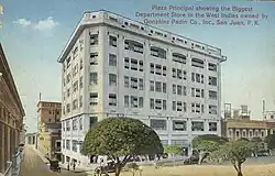 In 1912, the firm became González Padín y Co., Incorporated, and then Mr. Anselmo González Padin withdrew from the company, remaining, however, on the Island with his relatives. Don Jose González Padin then assumed the primary presidency of the firm. As the store had grown so much, it was necessary to make an extension to the premises, and the store extended to the Matienzo passage, to the three-story building next to the one it occupied. The first elevator for commercial use inside a store in San Juan was installed there. A soda fountain was also installed, the first in an establishment of its kind. The company would also later on open stores in Mayagüez and Ponce.[4] In 1923, at a cost of $750,000, González Padín would move to a new building which was built in the Main Plaza of San Juan, and would open their flagship store which became the "First Commercial Skyscraper" in Puerto Rico. San Juan finally had a large department store, facing the Plaza de Armas. The company continued its pioneering work in many details that were later on commonly used by businesses on the island. It was the first store to offer the home delivery service, and to have "a price for everyone", as the fixed price system that later on governed commerce on the island.[5][6]