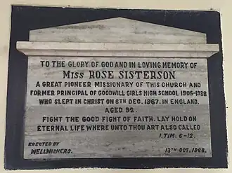 Rose Sisterson Memorial, Wesley Tamil Church, Haines Road, Bangalore