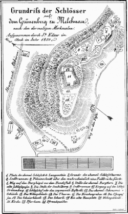 The complex of three ruined castles sit on a hill above the village of Melchnau. The Lords of Langenstein were first mentioned in 1194 when they helped found St. Urban's Abbey.[1] The castle was likely built around that same time. Shortly thereafter, the Barons of Grünenberg inherited the Langenstein lands which they ruled from Grünenberg Castle. Between the 12th and 15th centuries, Grünenberg Castle was a cultural and political center for the nobility that ruled over much of the Oberaargau region. As the family split into separate branches, including the Schnabel von Grünenberg, Grimm von Grünenberg and Grünenberg vom Albis, a third castle was added to the complex.[1]