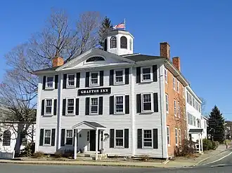The Grafton Inn is a historic inn at 25 Grafton Common in Grafton, Massachusetts, United States. The three-story wood-and-brick building was built in 1805 by Samuel Wood, with a design influenced by the work of Charles Bulfinch. The building was significantly enlarged c. 1865–75, doubling its size and adding the Italianate front porch. It is a wood-frame structure, with brick ends, a hip roof, and cupola-like belvedere.[2]