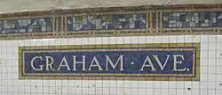 This underground station has two tracks and two side platforms.[5] Fixed platform barriers, which are intended to prevent commuters falling to the tracks, are positioned near the platform edges.[6][7] Both platforms have their original mosaic tile band showing various shades of green and blue with peach and yellow borders. "G" tablets on a dark blue background run at regular intervals. The mosaic name tablets read "GRAHAM AVE." in gold serif lettering on a blue background and gold border. There are no columns on either platform.