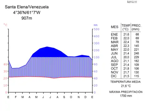 Due to the elevation of Gran Sabana, about 1,000 metres (3,300 ft) on average, the weather is quite pleasant, mild with average annual temperature of 20 °C (68 °F), similar to the valley of Caracas.