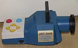 The projector-based game system was developed by Hong Kong company Playtime Products, and was released in other regions where it is known as the Light Games Color LCD Projector. It was Playtime's only console to be sold. Fantastiko released the "PROJECTOR MEGA VIDEO GAME Color LCD system" in Italy in 1988, while Grandstand rebranded it as "Light Games LCD Colour Projection System" for the UK, and Hunter Caesar Toys (Defunct in 1996) released it for Australia.[34] It is a tabletop projector-based machine with built-in controller, that runs games on small cartridges with LCD windows. Light would be directed through the LCD window and magnified onto a wall. The window was painted with a semi-transparent background and the black LCD display would block the light from passing through. This provided 'big screen' entertainment and was a novelty at the time. The visual design and "animation" being projected from these game carts is somewhat reminiscent of Nintendo's popular Game & Watch series of electronic handheld game devices that consist of a segmented LCD display being pre-printed with an overlay. The machine runs on D sized batteries and was available for sale in various parts of Europe including the UK.[35] Thirteen games were developed for it.[36]