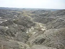 The East Block of the park is located about an hour's drive south of Assiniboia on the south side of the Wood Mountain Hills in Census Division No. 3. The interpretive centre is in the McGowan House at the new Rock Creek Campground and the information centre is at the museum in Wood Mountain Regional Park.[12] The East Block is more of a wilderness area but has views of the badlands of Rock Creek, the Cretaceous–Paleogene boundary, and prairie skies. A one-lane, 11-kilometre (6.8 mi) parkway traverses the Rock Creek Badlands.[13] The East Block contains the Grasslands National Park (east) (SK 023) Important Bird Area.[14]
