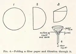 The solution is poured through a piece of filter paper folded into a cone in a glass funnel. Solids (or flocs) remain on the filter paper while the filtered solution is caught by a flask under the funnel.[6] If a large volume of solution is filtered, the filter paper will need to be changed in order to prevent clogging.[7]