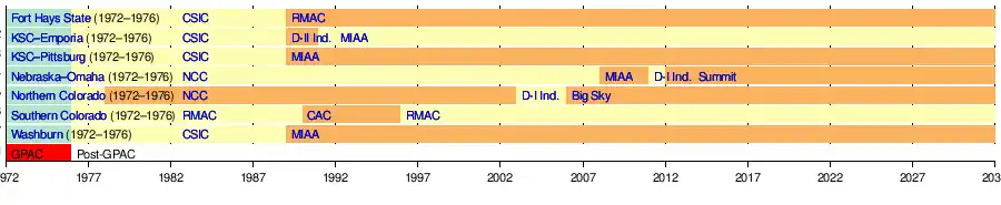 The Great Plains Athletic Conference (GPAC) was a college athletic conference affiliated with the National Association of Intercollegiate Athletics (NAIA), operated in the western United States. It was aligned with the Rocky Mountain Athletic Conference (RMAC). The two allied conferences worked under the name of the Mountain and Plains Intercollegiate Athletic Association (MPIAA).[1] It was announced on May 15, 1972. The founding schools were Fort Hays State College (now Fort Hays State University); Kansas State College of Emporia (now Emporia State University); Kansas State College of Pittsburg (now Pittsburg State University); Southern Colorado State College (now Colorado State University–Pueblo); the University of Nebraska at Omaha, the University of Northern Colorado and Washburn University.[2] The conference only lasted four years, as Nebraska–Omaha and Northern Colorado left for the North Central Conference (NCC), Southern Colorado went back to the RMAC, and the rest of the schools started the Central States Intercollegiate Conference (CSIC), which merged into the Mid-America Intercollegiate Athletics Association (MIAA) effective in the 1989–90 school year.