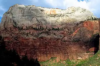 The Great White Throne[2] is a monolith, predominantly composed of white Navajo Sandstone in Zion National Park in Washington County in southwestern Utah, United States.[1] The north-west "main" face rises 2,350 feet (720 m) in 1,500 feet (460 m) from the floor of Zion Canyon near Angels Landing. It is often used as a symbol of Zion National Park. The Great White Throne can be seen from most locations along the scenic drive running through Zion Canyon.