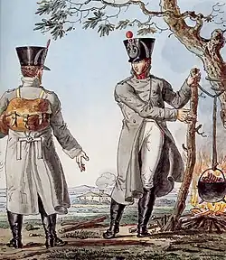 The drape of the greatcoat reached to below the knee of the wearer, the short cape drapes to the elbow, and the capacious external pockets allow the wearer to carry dry food and other items; an example is the Petersham coat, named after Viscount Petersham.[2] In the fashion of the Regency era (1795–1837) a greatcoat might feature several short capes, usually designed, cut, and tailored to the specifications of fit and aesthetic taste of a dandy.[3]