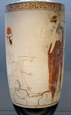 Relief from a carved funerary lekythos at Athens: Hermes as psychopomp conducts the deceased, Myrrhine, to Hades, ca 430-420 BCE (National Archaeological Museum of Athens).