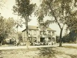 The institution that would become East High School began in 1856 with the construction of Green Bay's Sale School (nicknamed "Old Brick") on land donated to the city by fur trader John Jacob Astor. Sale was the first school built by the Green Bay Area Public School District. The school traces its formal beginnings (celebrating a sesquicentennial in 2011) to a Professor Furber, who added Latin and mathematics to the grade school curriculum in 1860.[2] The first class to receive diplomas, consisting of four men and two women, was the class of 1875.[2] The school moved to a new location on South Webster Avenue in 1893 and its students became known as the Hilltoppers. After the move, "Old Brick" continued to be used by the school district for administrative purposes, and was torn down in 1957.[3] While at the Hilltopper building, the school published a literary magazine called Aeroplane beginning in 1910. The publication's commencement edition served as a pseudo-yearbook, and began printing directories of the whole school in its 1917 edition.[4] The publication was renamed East High Aeroplane in 1924 in anticipation of the school's move to its new location.[5]