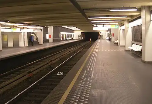 Gribaumont (French pronunciation: [ɡʁibomɔ̃]) is a Brussels Metro station on the eastern branch of line 1. It is located in the municipality of Woluwe-Saint-Lambert, in the eastern part of Brussels, Belgium. It is located under the Avenue de Broqueville/De Broquevillelaan and takes its name from the nearby Avenue Louis Gribaumont/Louis Gribaumontlaan, named after the landowner who helped develop the area in the 1900s.[1]