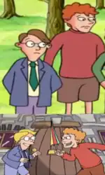 Episodes are faithful to the original story, however, there are some minor changes. For example, the Cluck family in the eponymous story "The Dumb Clucks"[21] were renamed the Klutz family, and the title was expectantly adjusted.[22] Other notable changes included the use of character models that were constantly reused in many episodes either with minor adjustments or not, alternating between main and background characters: the character model for Dorothy May Piranha from "The Piranha Sisters"[23] is the same "actress" who was Savannah Slumberson in "The Grub-A-Blub Blub".[24] However, the set character appearances occasionally led to an appearance deviation from how the character was described in the original story: the bullying Ginger Pie in "Knock Down Ginger" was described as a tall, overweight boy with pale skin and pale red hair,[25] but his character model – the same one used for Ginger (no relation) in "The Chipper Chums Go Scrumping"[19] (who was a boy implied to be very outdoorsy with his friends) – was a skinny boy with curly red hair.[19][20] Loralilee's witch doctor cure in "Doctor Moribundus"[26] was adapted out of the cartoon, replaced with the Squeam Screen caretaker's narration claiming that the cure was too disturbing to tell as the viewer is shown the outside her bedroom window,[27] and Stinker's murder in "The Chipper Chums Goes Scrumping"[28] is changed to becoming crippled.[19]