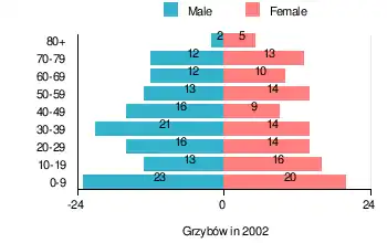 According to the 2002 Poland census, there were 243 people residing in Grzybów village, of whom 52.7% were male and 47.3% were female. In the village, the population was spread out, with 26.7% under the age of 18, 33.7% from 18 to 44, 20.2% from 45 to 64, and 19.3% who were 65 years of age or older.[1]