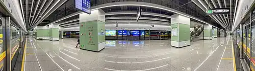 Guanzhou Station (Chinese: 官洲站; pinyin: Guānzhōu Zhàn; Cantonese Yale: Gūnjāu Jaahm) is an interchange station between Line 4 and Line 12 of the Guangzhou Metro. The Line 4 station started operations on 26 December 2005. It is located at the underground of the central part of Guanzhou Island in Haizhu District.[1] It was constructed to cope with the Guangzhou International Biological Island,[2] a science and technology development zone led by biological industry that opened in 2011.[3][4]
