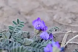 It grows from 5-10 cm tall, and has long, thick roots.[1] The leaves grow from the root and are pinnate, with 4-8 pairs of leaflets, and having a short protrusion at the end.[1] The petioles are 3-8 cm long, and covered in long brown hairs.[1] The stipules are ovate and have long, recumbent hairs.[1] The flower stalk is 4-9 cm long, covered with long brown hairs, is leafless, and has 1-4 flowers in a corymb.[1] The purple flowers bloom in July and August.[1] In South Korea, it grows in Gyeongsan, Chilgok, and Daegu in Gyeongsangbuk-do, and is a rare plant.[1]