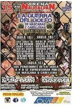 Guerra del Golfo (2015) (Spanish for "Gulf War") was the eight installment of an annual professional wrestling major event produced by Mexican professional wrestling promotion International Wrestling Revolution Group (IWRG), which took place on March 15, 2015 in Arena Naucalpan, Naucalpan, State of Mexico, Mexico. The annual Guerra del Golfo main event consists of three matches in total, with two "qualifying matches", multi-man steel cage matches where the last person left in the cage advances to the main event of the night. The two losers would then be forced to wrestle inside the steel cage, with the loser of that match being forced to either take off their wrestling mask or have their hair shaved off under Lucha de Apuestas, or "Bet match" rules, if they are unmasked.