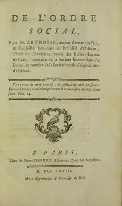 Guillaume-François Le Trosne (13 October 1728 in Orléans – 26 May 1780 in Paris), was a French jurist and economist.[1] He is one of the main figures of physiocracy, a school of thought founded by François Quesnay and the Marquis de Mirabeau in July 1757.[2]