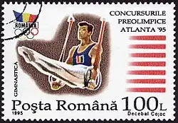 ![]() Romanian stamp commemorating 1996 Olympic gymnastics depicting a man competing on the rings | ||||||||||
