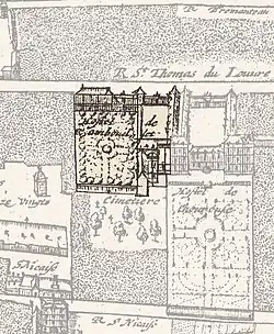 The Hôtel de Rambouillet[2] (French pronunciation: [otɛl ʁɑ̃bujɛ]), formerly the Hôtel de Pisani ([otɛl pizani]), was the Paris residence of Catherine de Vivonne, marquise de Rambouillet, who ran a renowned literary salon there from 1620 until 1648.[3] It was situated on the west side of the rue Saint-Thomas-du-Louvre, just north of Marie de Rohan's Hôtel de Chevreuse, in a former quarter of Paris (demolished during the 19th century), located between the Louvre and Tuileries palaces, near the then much smaller Place du Carrousel,[1] in the area of what was to become the Pavillon Turgot of the Louvre Museum.
