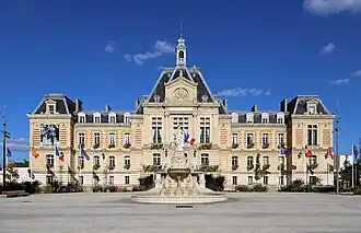 Following the death of a deputy mayor, Olivier Delhomme, who left a large sum of money to the town in his will when he died in 1874, the town council decided to demolish the dilapidated castle and to build a purpose-built town hall on the same site. A monumental fountain, sculpted by Louis-Émile Décorchemont, was unveiled in the centre of the site in 1882.[5]