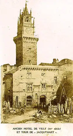 The architectural historian, Prosper Mérimée, was highly critical of the concept of embedding the belfry in the new building: "On voit ici la tour gothique du Jacquemart, seule partie conservée de l'ancien hôtel de ville , qui émerge de la mairie comme les perdrix dans les pâtés de Pithiviers." (English: Here we see the Gothic tower of Jacquemart, the only preserved part of the old town hall, which emerges from the town hall like partridges in the pâtés of Pithiviers.)[12]