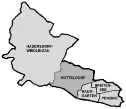 Hütteldorf (German pronunciation: [ˈhʏtl̩ˌdɔʁf] ; Central Bavarian: Hittldorf) is a part of Vienna's 14th district, Penzing. It is located in the west of Vienna, in the geographical center of the district, stretching roughly from Deutschordenstraße (which forms the border to Baumgarten) in the east to Wolf in der Au in the west, where Hütteldorf borders Hadersdorf-Weidlingau.
