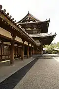 The kondō, located side by side to the pagoda in Sai-in, is another one of the oldest wood buildings extant in the world. The hall measures 18.5 meters by 15.2 meters.[18] The hall has two stories, with roofs curved in the corners. Only the first story has a double roof. This was added later in the Nara period with extra posts to hold up the original first roof because it extended more than four meters past the building.[22]