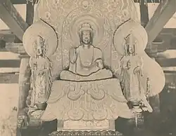 The statue of Yakushi of the original temple was saved during the fire of 670.[42] While the temple was being rebuilt the Shaka Triad was commissioned or had been already cast.