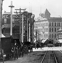 View towards the south of the side of H. Jevne & Co. ("ne Grocer Coffees and Teas") on N. Spring around 1893–6. At back, Hotel Nadeau at the corner of 1st St. -