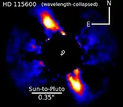 On May 26, 2015 a team led by Thayne Currie, Carey Lisse, and Marc Kuchner announced the discovery of a scattered light-resolved debris disk[8] likely responsible for the system's strong infrared excess around HD 115600 using the Gemini Planet Imager.