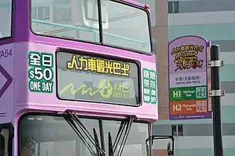 The Rickshaw Sightseeing Bus was introduced on 18 October 2009, intended to reminisce the early days of Hong Kong for visitors and local citizens, and also to facilitate the up-growing demand of individual travelers.[1] Before 13 December 2014, there were two routes which called "H1 Heritage Tour" and "H2 Metropolis Tour", but it merged into a route with the new crossing-harbour trip.